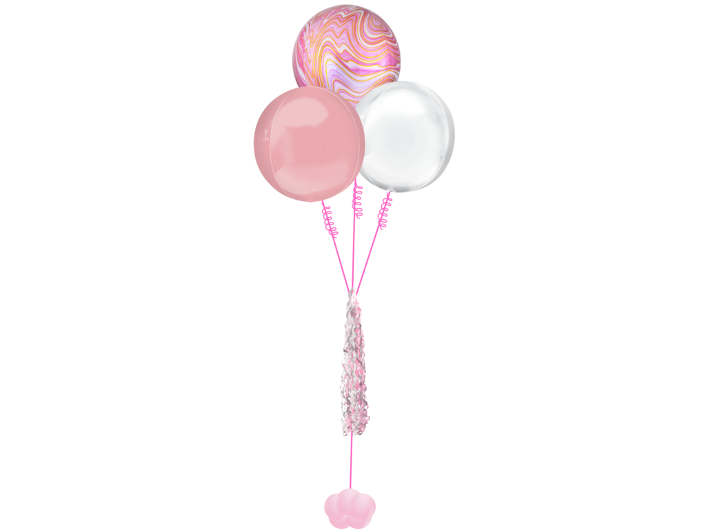Helium bundle that includes 3 Orbz balloons with tassel and bubble cluster balloon weight.