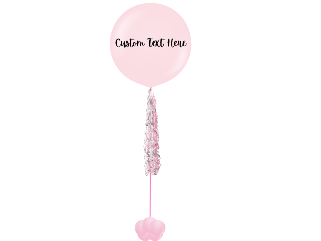 36″ Jumbo latex balloon with tassel, custom vinyl lettering, and bubble cluster balloon weight.