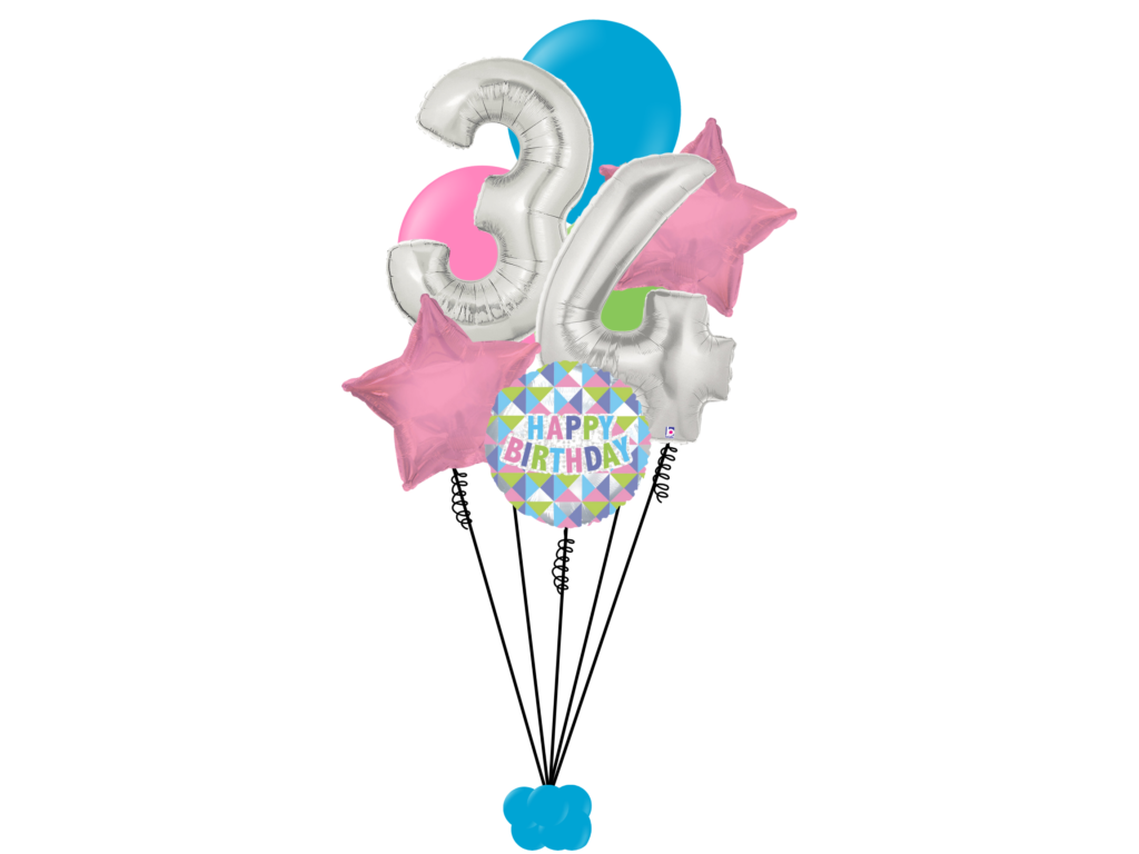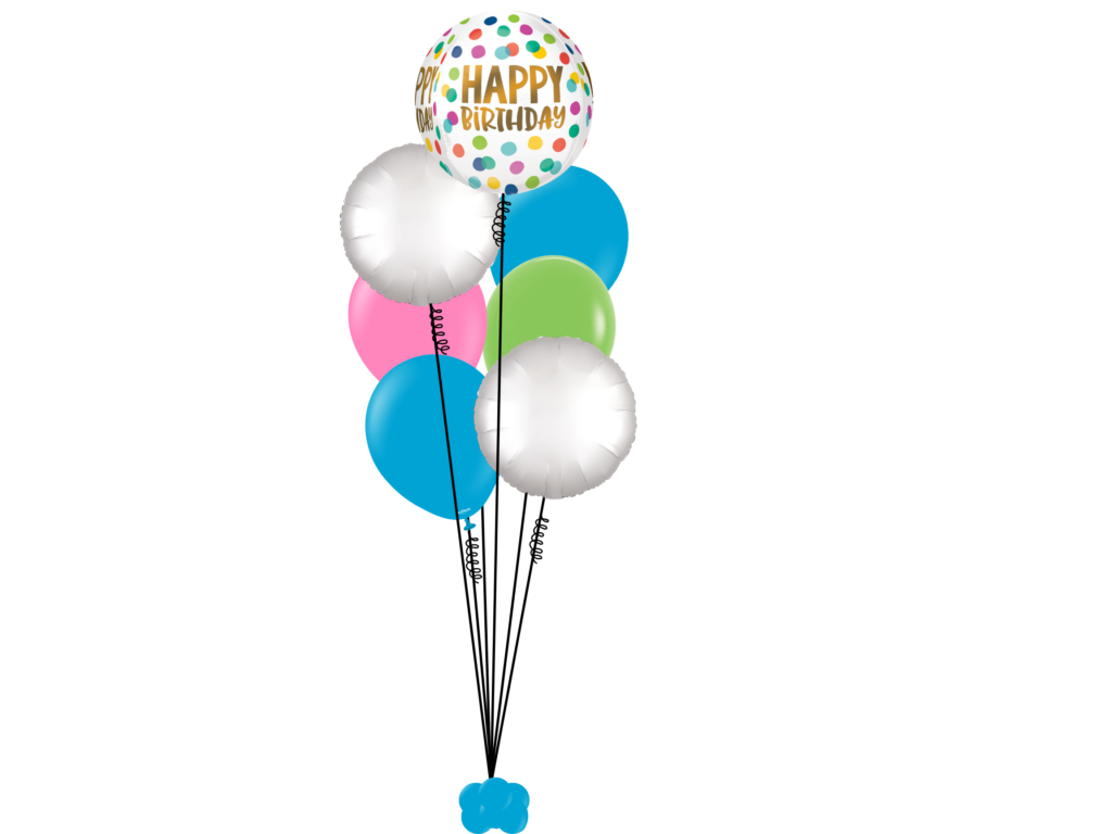 Helium bouquet that includes 3-17″ latex balloons, 2 basic shape foil balloons, 1 Happy Birthday foil balloon and 2 large number balloons with a bubble cluster balloon weight. Add a tassel for $5!