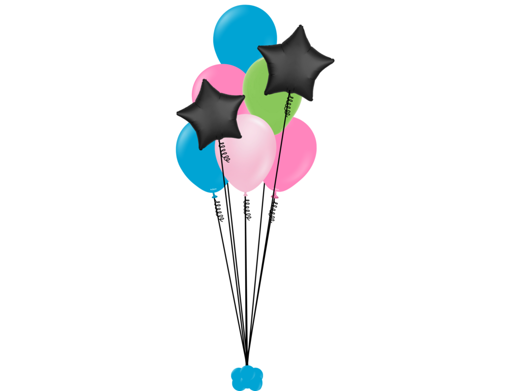 Helium bouquet that includes 6-17″ latex balloons and 2 small foil balloons with a bubble cluster balloon weight. Add a tassel for $5!